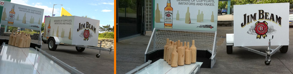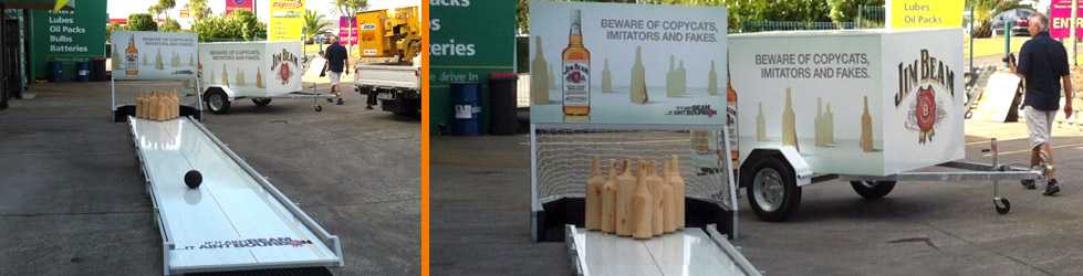 Tech Specs | 10m x 1m bowling alley unbolts into 4 parts | Turned wooden bottles | 1.5m x 2m x 1m Net and Promo Display